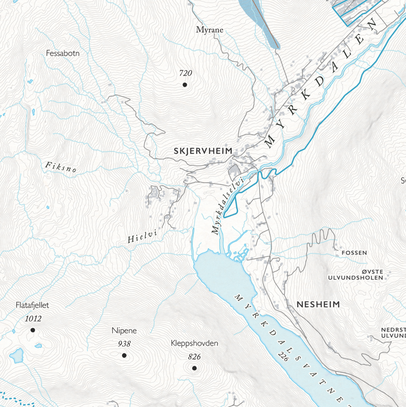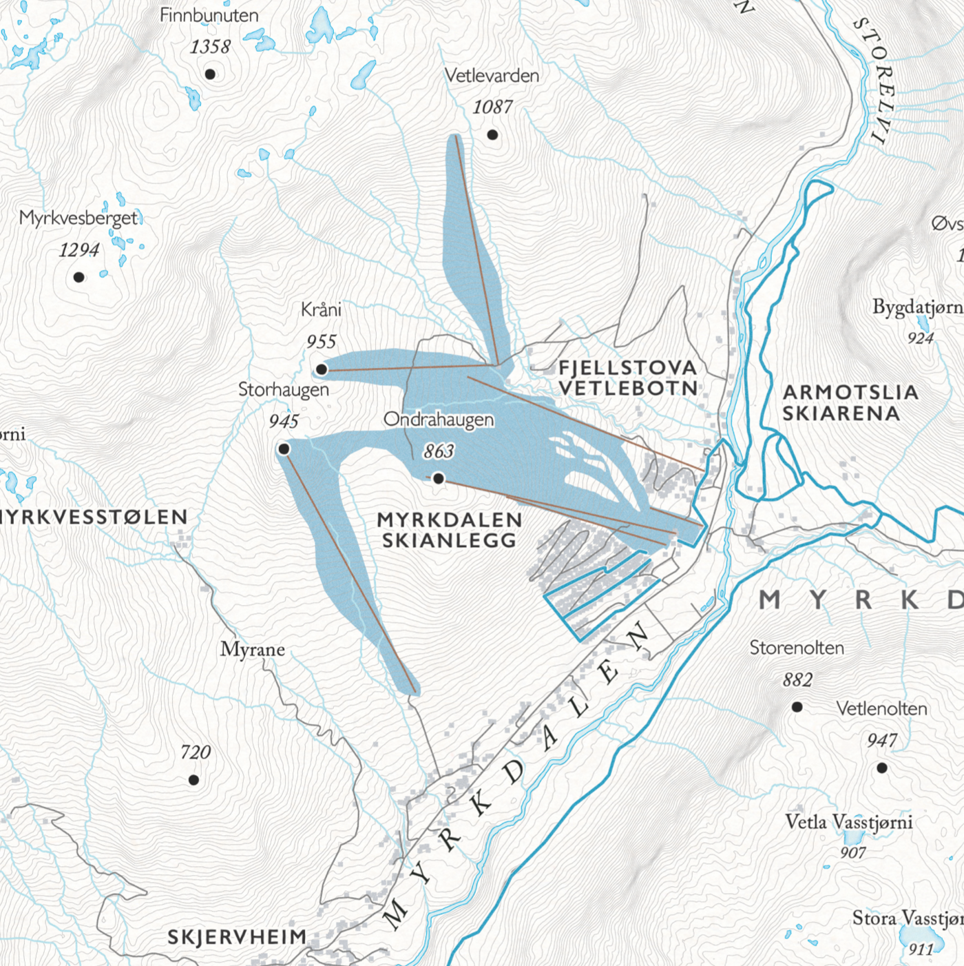 Kartet ble ble utarbeidet sammen med lokalkjente kunder som har bidratt med detaljer og kunnskap. Spesielt takk til medlemmene i gruppen Myrkdalen Fjelllandsby Bli med der om du har hytte i området.