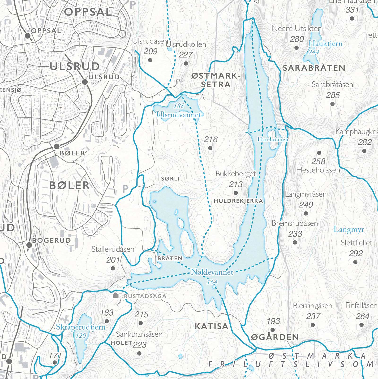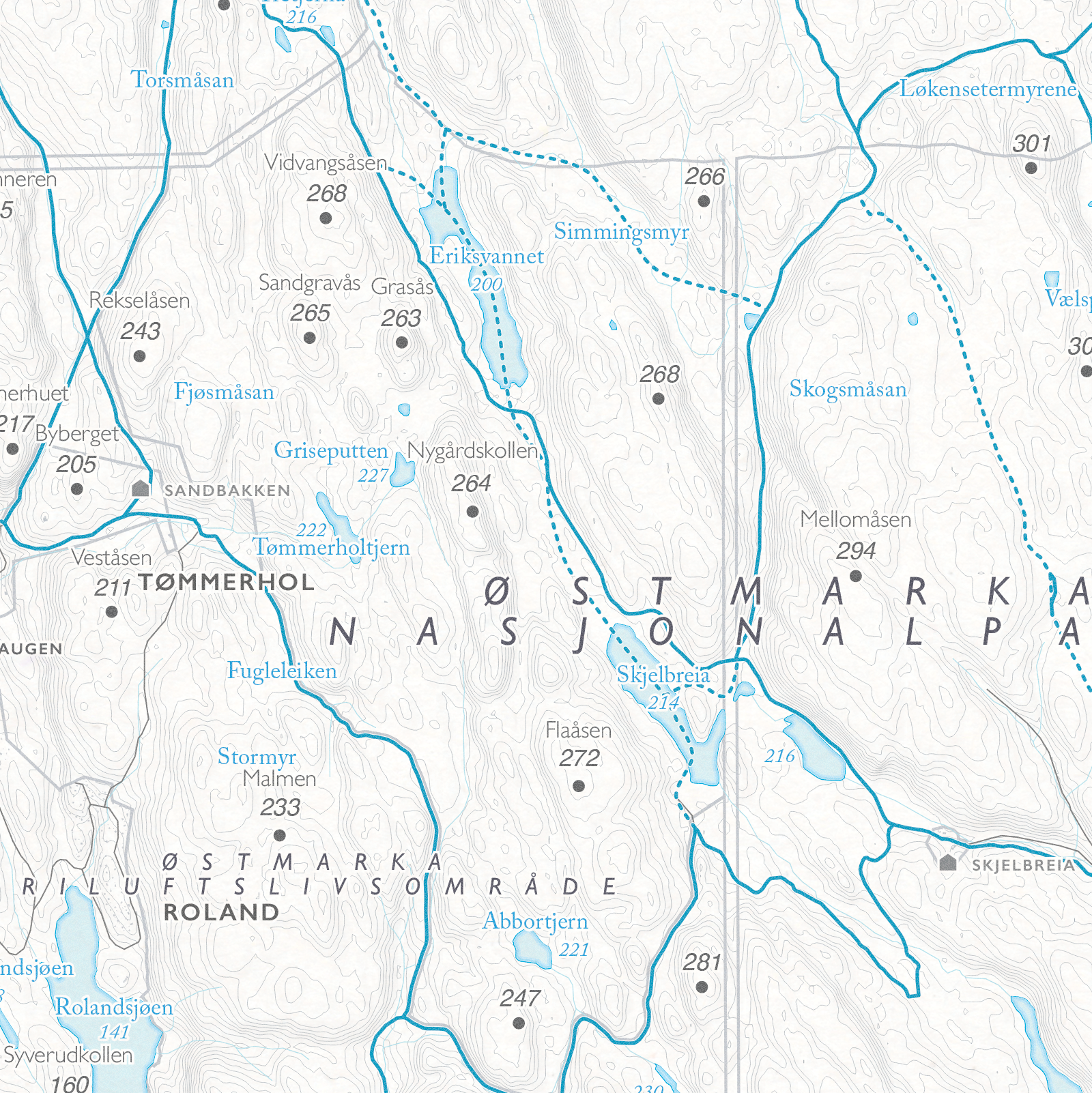 Kartet viser alle skiløyper i den nordlige delen av Østmarka. Rutene og stiene kommer fra Kartverkets nasjonal database for turruter. Les mer her.