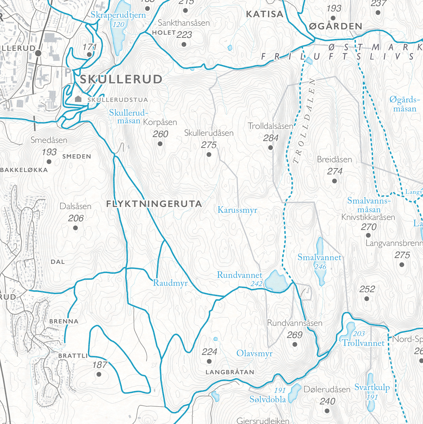 Vårt kommende skikart over den nordlige delen av Østmarka. Fra Ellingsrud i nord til Vangen i sør og Skullerud i vest til Røyrivann i øst. Kartet forventes å ferdigstilles i løpet av oktober.