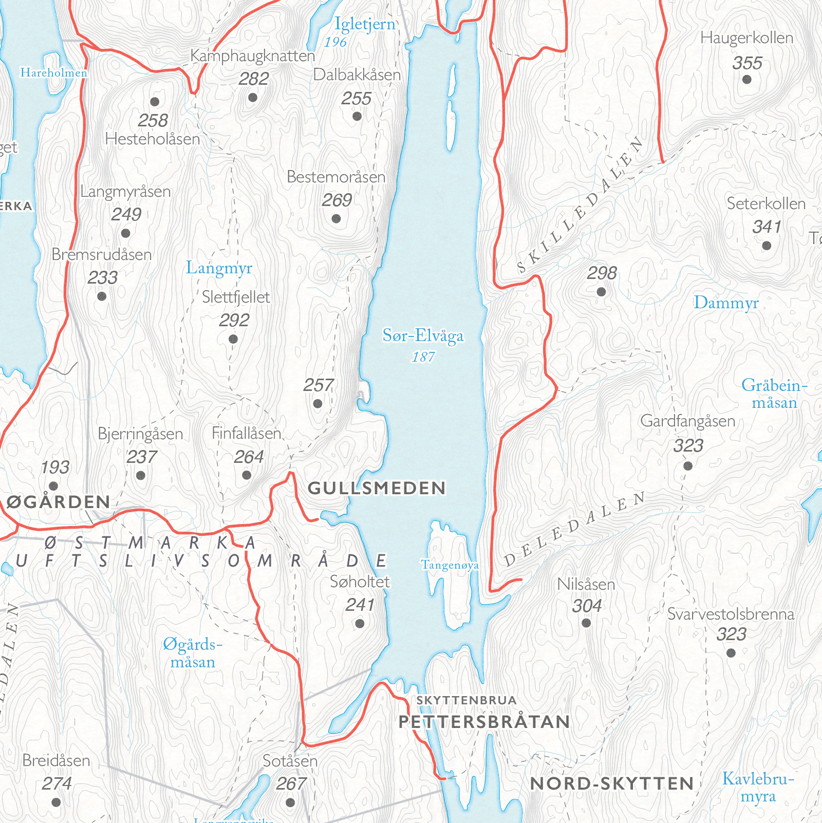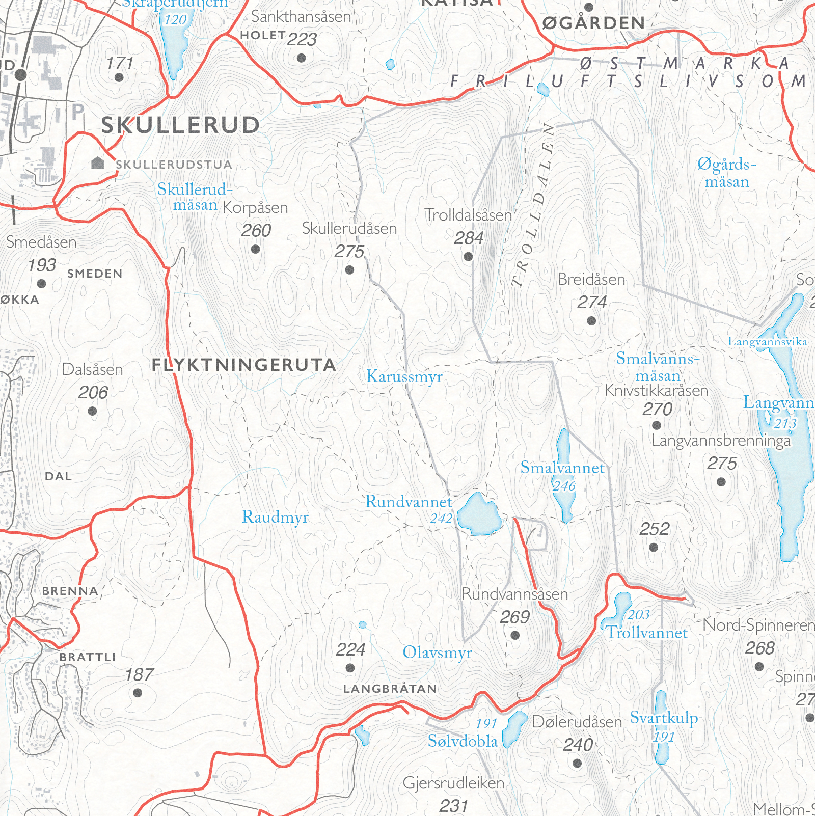 Kartet viser grusløyper og trillestier i den nordlige delen av Østmarka. Rutene og stiene kommer fra Kartverkets nasjonal database for turruter. Les mer her.