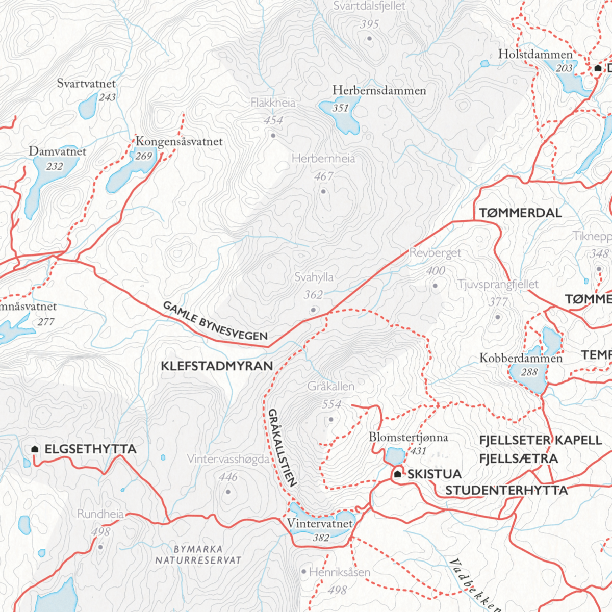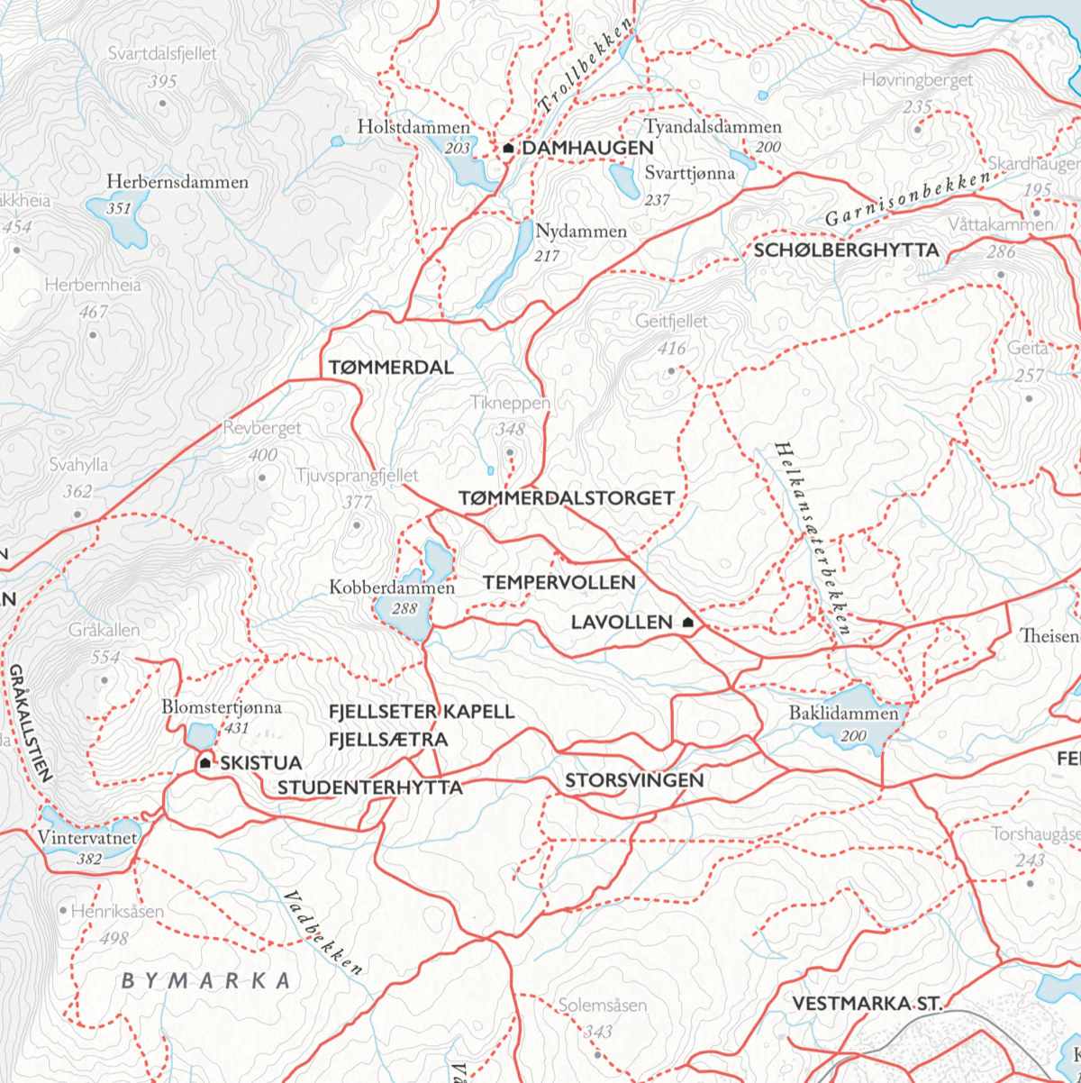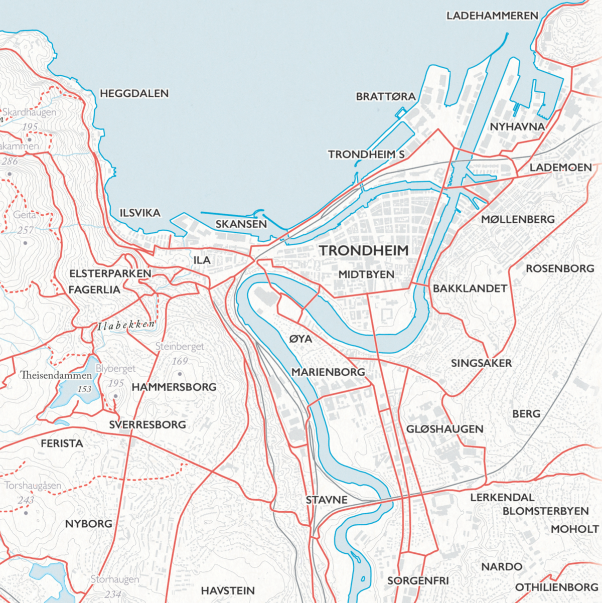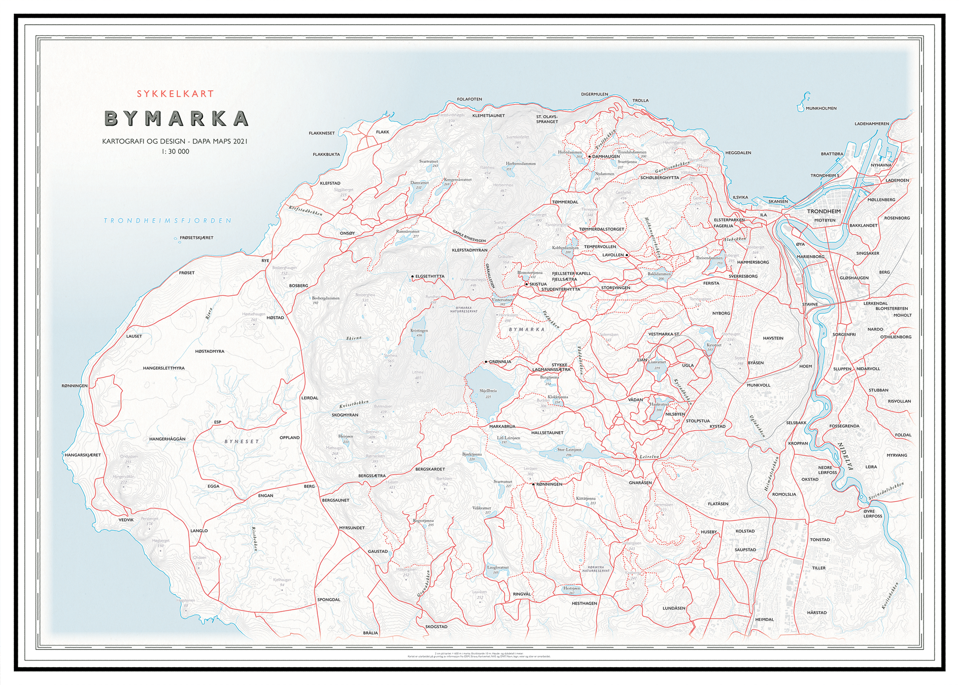 Sykkelkartet over Bymarka i Trondheim viser deg alle grusruter og noen utvalgte klassikere på sti du kan sykle fra Byneset i vest til Nidelva i øst.