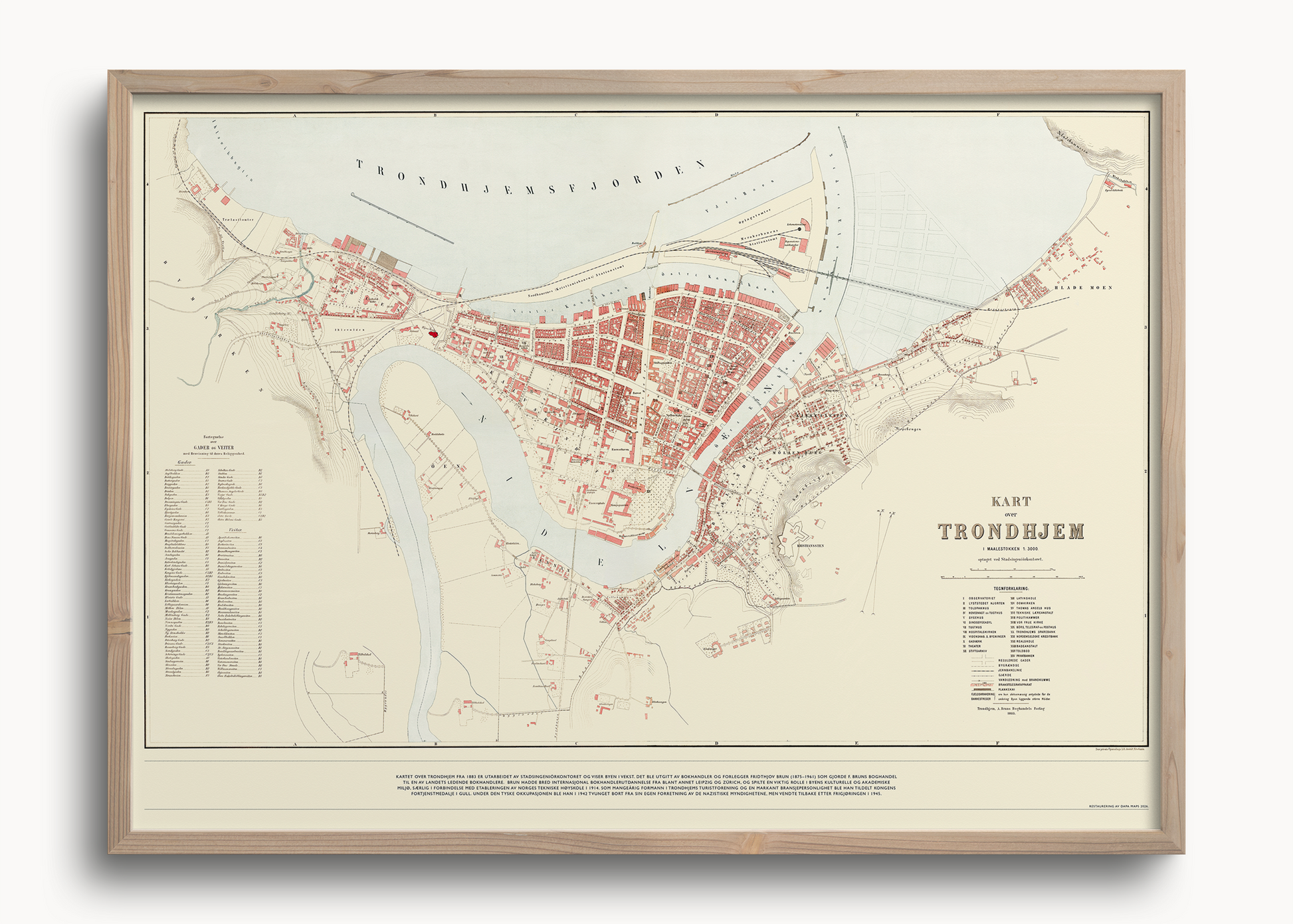 Dette restaurerte kartet over Trondhjem fra 1883 ble utgitt i en periode da byen var i sterk vekst. Kartet ble publisert av bokhandler og forlegger Fridthjov Brun, som gjennom sitt forlag formidlet kart, håndbøker og lokalhistoriske verk fra Trøndelag.